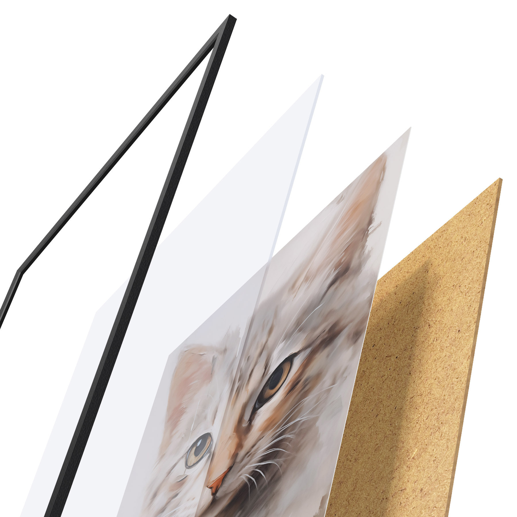 De poster bestaat uit een frame, plexiglas, geprinte afbeelding en spaanplaat achterkant. De poster kan meteen aan de muur worden gehangen dankzij de bevestigingen op de achterkant.