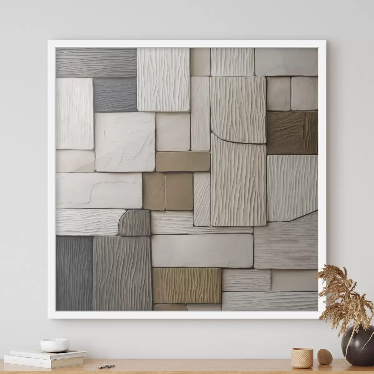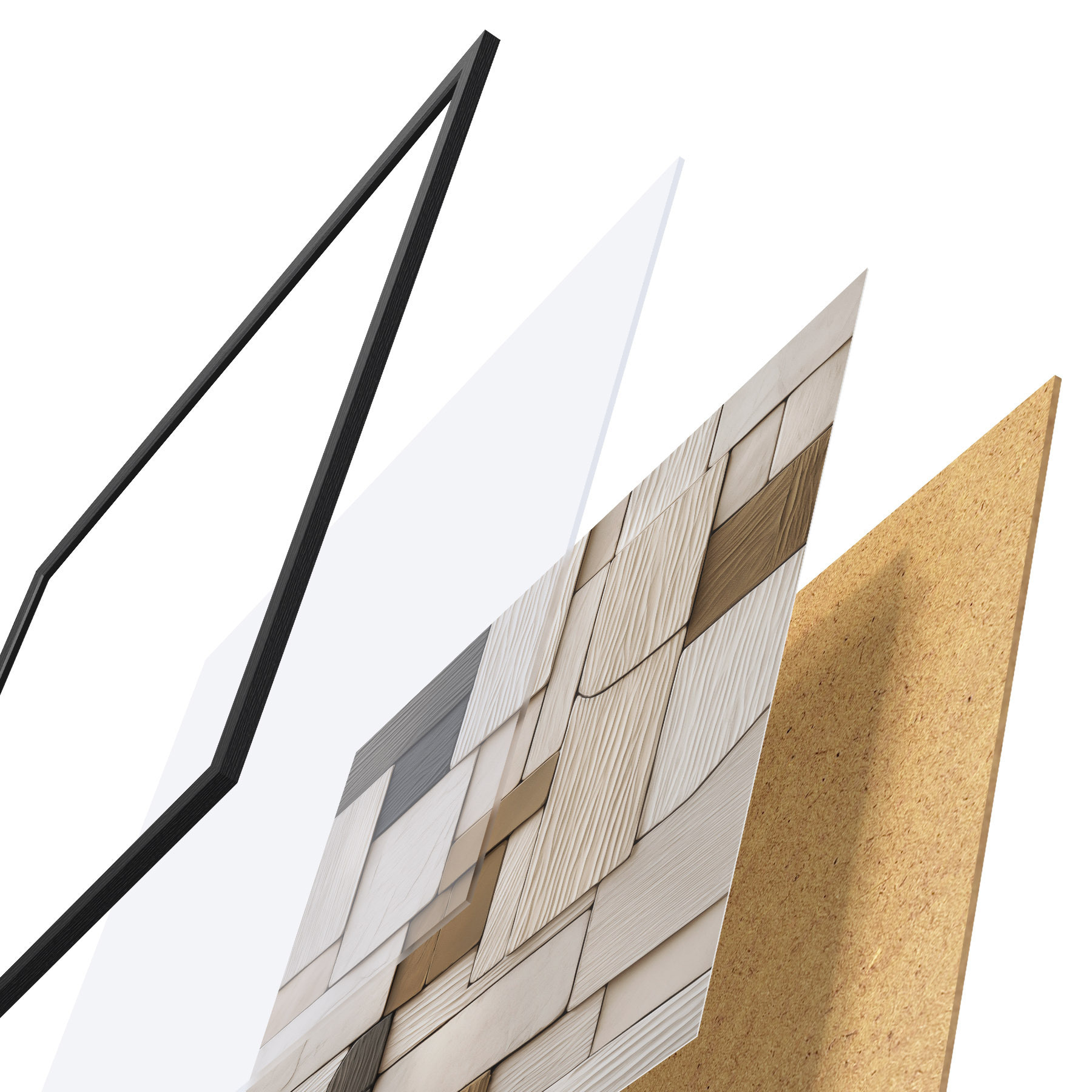 De poster bestaat uit een frame, plexiglas, geprinte afbeelding en spaanplaat achterkant. De poster kan meteen aan de muur worden gehangen dankzij de bevestigingen op de achterkant.