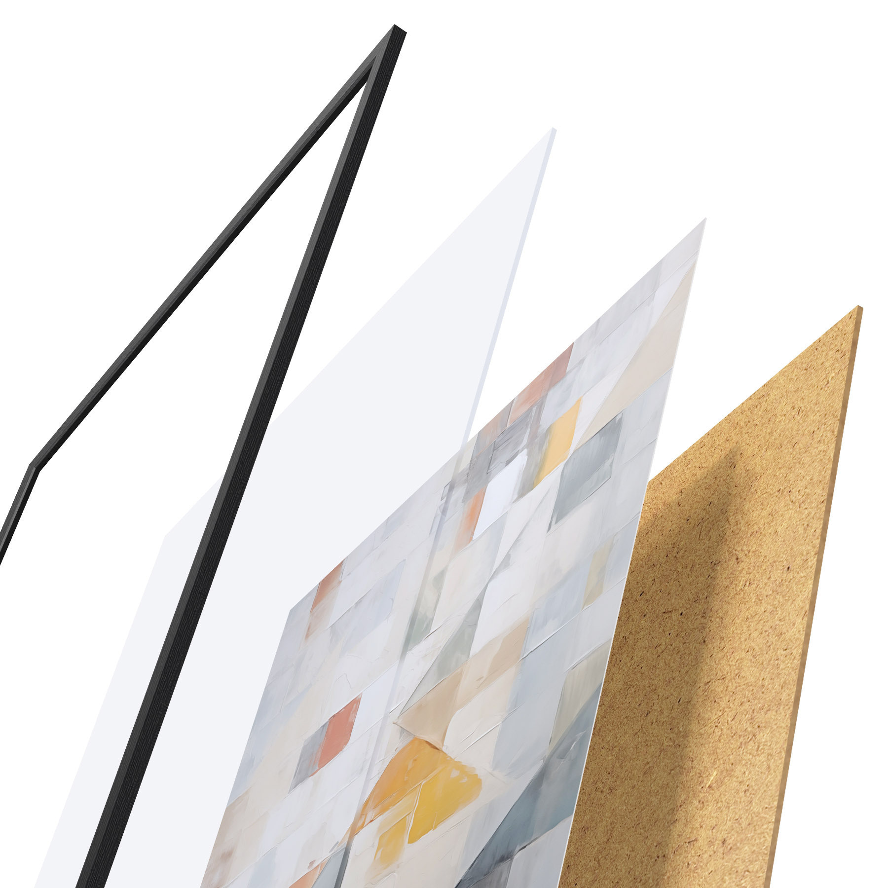 De poster bestaat uit een frame, plexiglas, geprinte afbeelding en spaanplaat achterkant. De poster kan meteen aan de muur worden gehangen dankzij de bevestigingen op de achterkant.