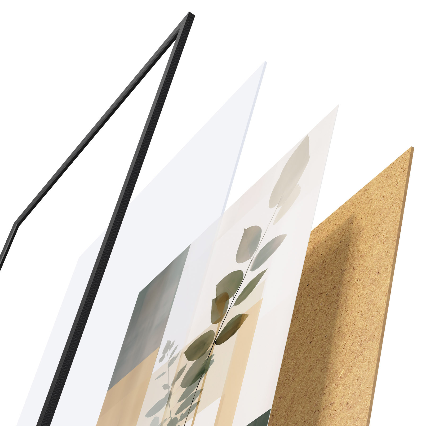 De poster bestaat uit een frame, plexiglas, geprinte afbeelding en spaanplaat achterkant. De poster kan meteen aan de muur worden gehangen dankzij de bevestigingen op de achterkant.