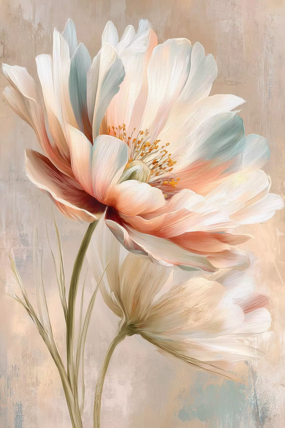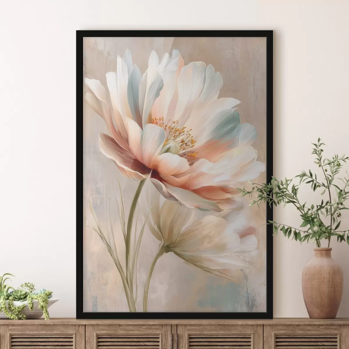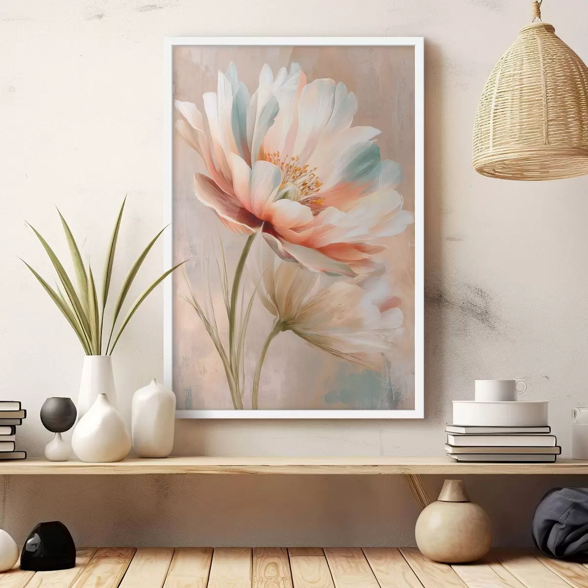 Poster Verfijnde pioenrozen in een beige en koraalkleurig palet, in de stijl van een olieverfschilderij N° f48184