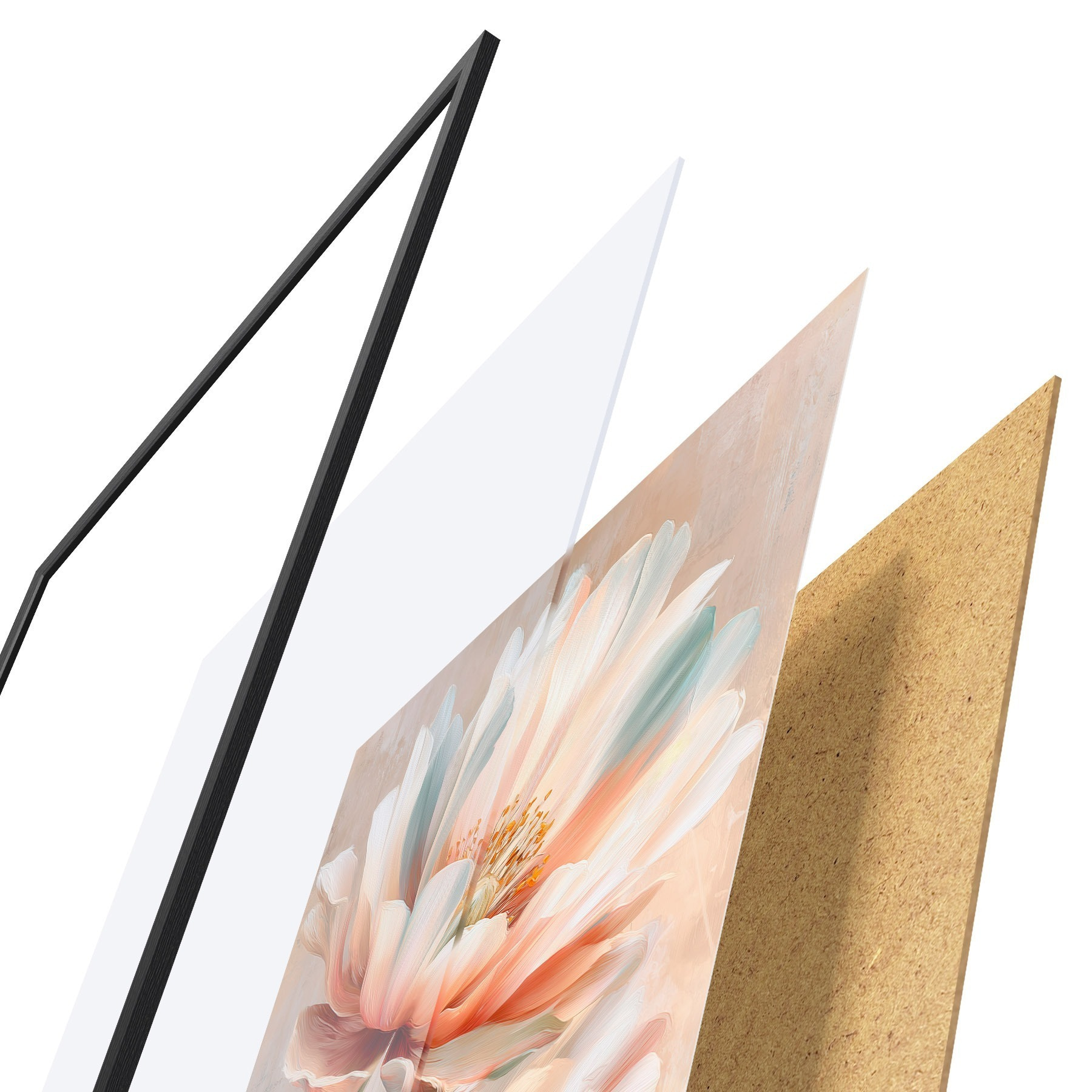 De poster bestaat uit een frame, plexiglas, geprinte afbeelding en spaanplaat achterkant. De poster kan meteen aan de muur worden gehangen dankzij de bevestigingen op de achterkant.