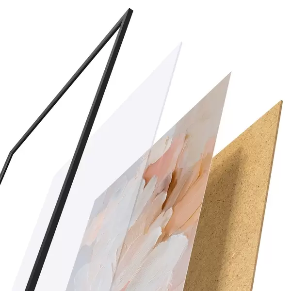 De poster bestaat uit een frame, plexiglas, geprinte afbeelding en spaanplaat achterkant. De poster kan meteen aan de muur worden gehangen dankzij de bevestigingen op de achterkant.