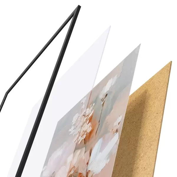 De poster bestaat uit een frame, plexiglas, geprinte afbeelding en spaanplaat achterkant. De poster kan meteen aan de muur worden gehangen dankzij de bevestigingen op de achterkant.