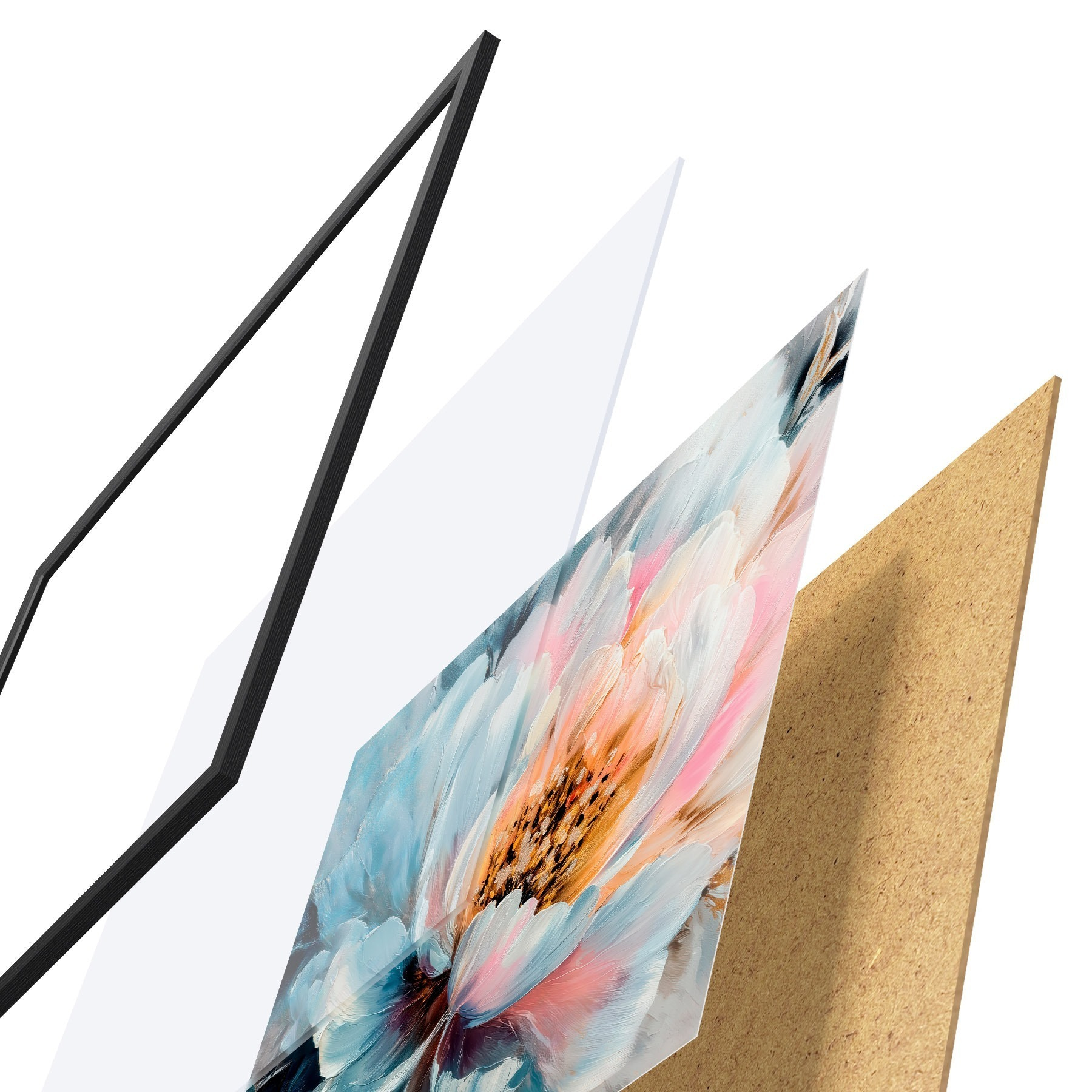 De poster bestaat uit een frame, plexiglas, geprinte afbeelding en spaanplaat achterkant. De poster kan meteen aan de muur worden gehangen dankzij de bevestigingen op de achterkant.