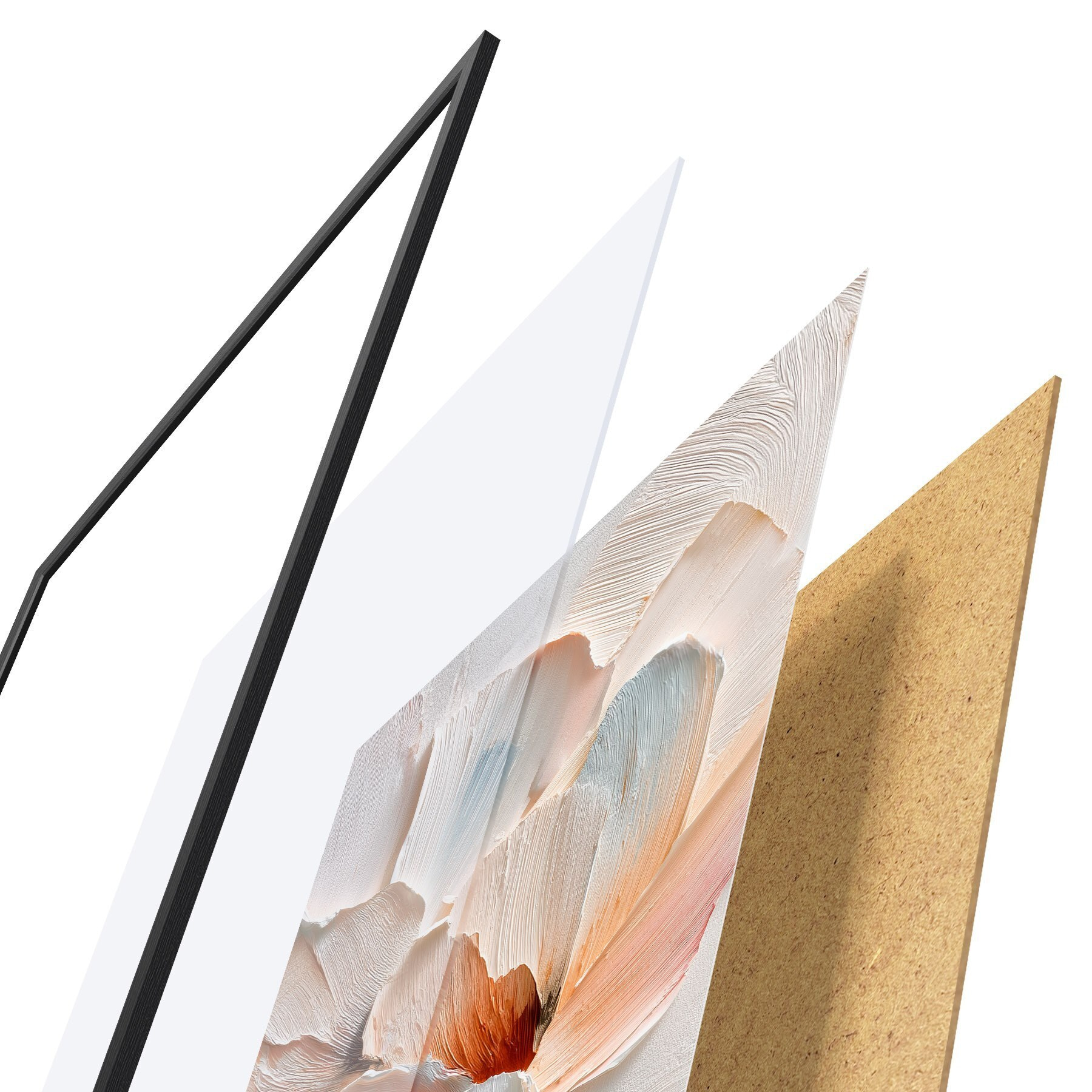 De poster bestaat uit een frame, plexiglas, geprinte afbeelding en spaanplaat achterkant. De poster kan meteen aan de muur worden gehangen dankzij de bevestigingen op de achterkant.