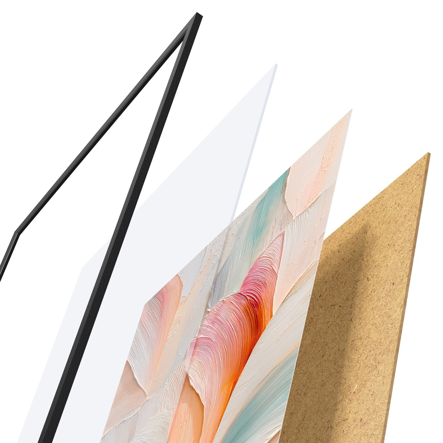 De poster bestaat uit een frame, plexiglas, geprinte afbeelding en spaanplaat achterkant. De poster kan meteen aan de muur worden gehangen dankzij de bevestigingen op de achterkant.