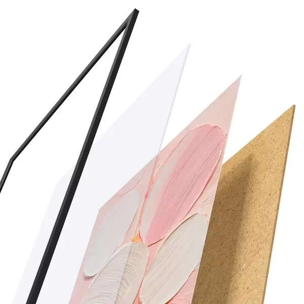 De poster bestaat uit een frame, plexiglas, geprinte afbeelding en spaanplaat achterkant. De poster kan meteen aan de muur worden gehangen dankzij de bevestigingen op de achterkant.