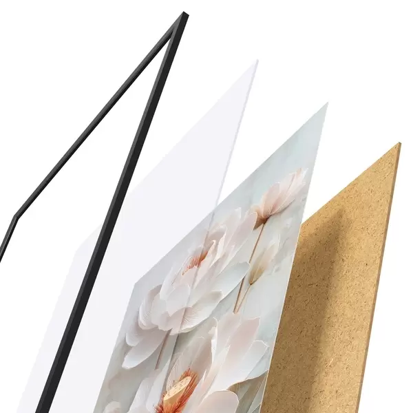 De poster bestaat uit een frame, plexiglas, geprinte afbeelding en spaanplaat achterkant. De poster kan meteen aan de muur worden gehangen dankzij de bevestigingen op de achterkant.