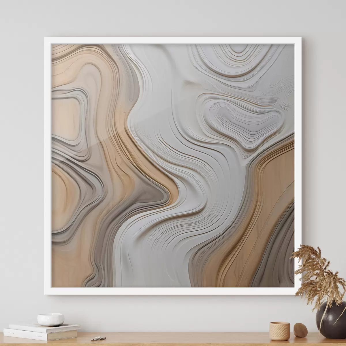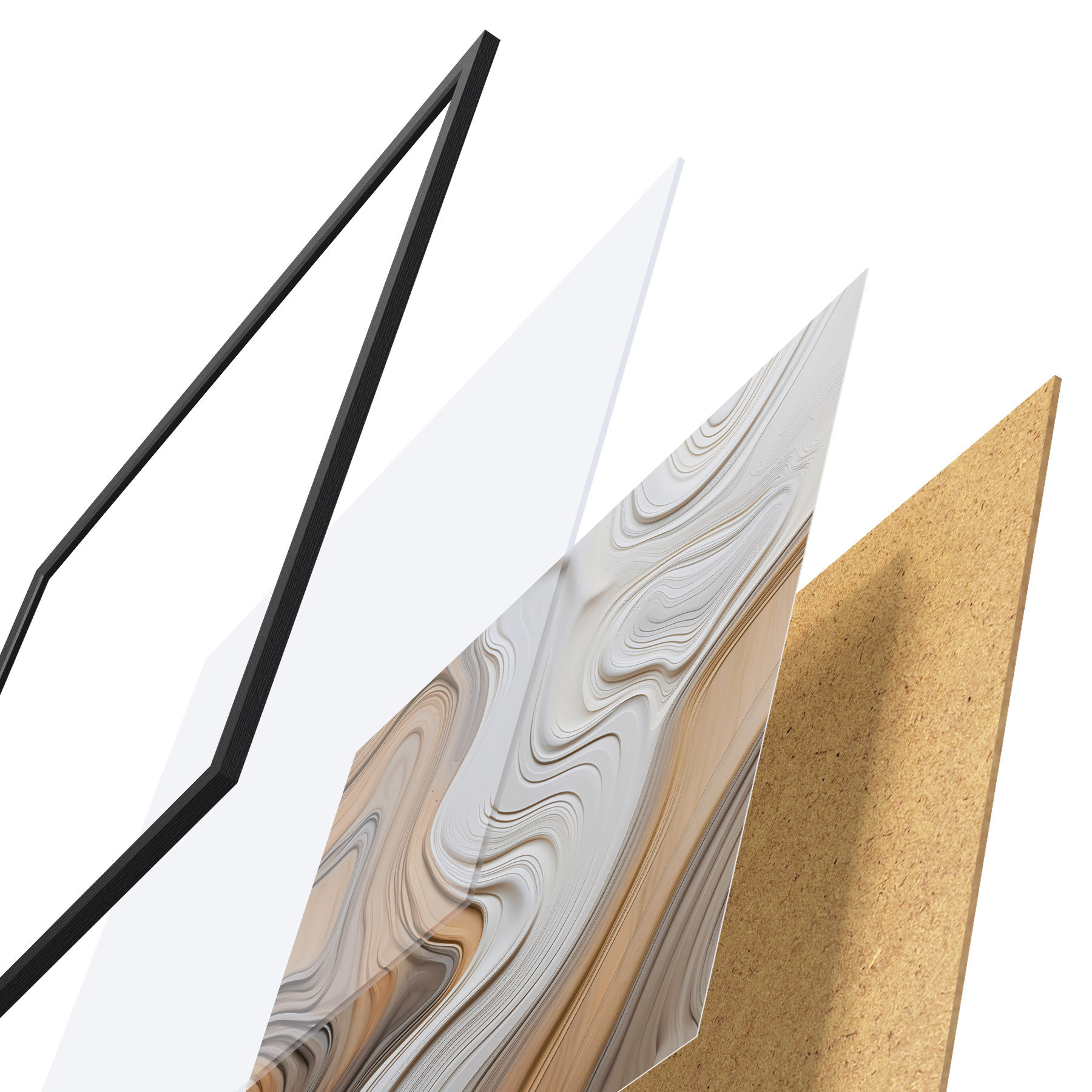 De poster bestaat uit een frame, plexiglas, geprinte afbeelding en spaanplaat achterkant. De poster kan meteen aan de muur worden gehangen dankzij de bevestigingen op de achterkant.