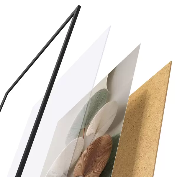 De poster bestaat uit een frame, plexiglas, geprinte afbeelding en spaanplaat achterkant. De poster kan meteen aan de muur worden gehangen dankzij de bevestigingen op de achterkant.