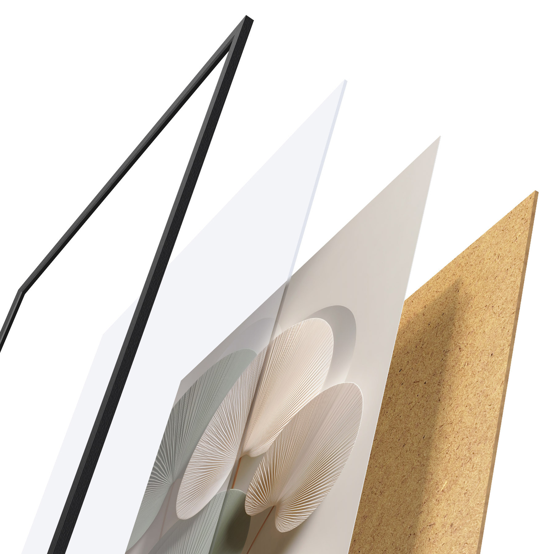 De poster bestaat uit een frame, plexiglas, geprinte afbeelding en spaanplaat achterkant. De poster kan meteen aan de muur worden gehangen dankzij de bevestigingen op de achterkant.