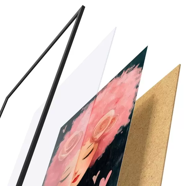 De poster bestaat uit een frame, plexiglas, geprinte afbeelding en spaanplaat achterkant. De poster kan meteen aan de muur worden gehangen dankzij de bevestigingen op de achterkant.