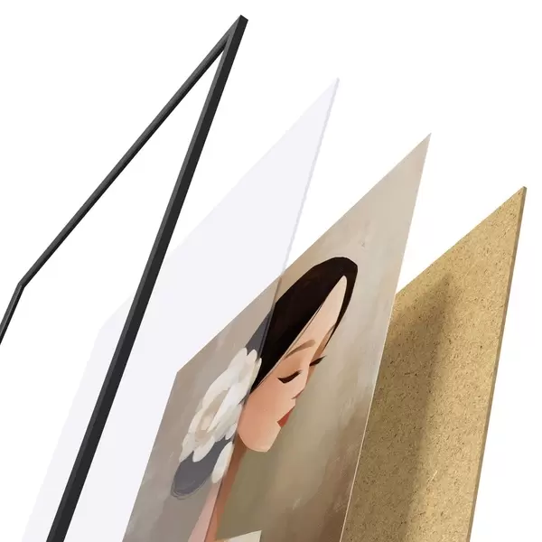 De poster bestaat uit een frame, plexiglas, geprinte afbeelding en spaanplaat achterkant. De poster kan meteen aan de muur worden gehangen dankzij de bevestigingen op de achterkant.