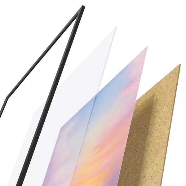 De poster bestaat uit een frame, plexiglas, geprinte afbeelding en spaanplaat achterkant. De poster kan meteen aan de muur worden gehangen dankzij de bevestigingen op de achterkant.