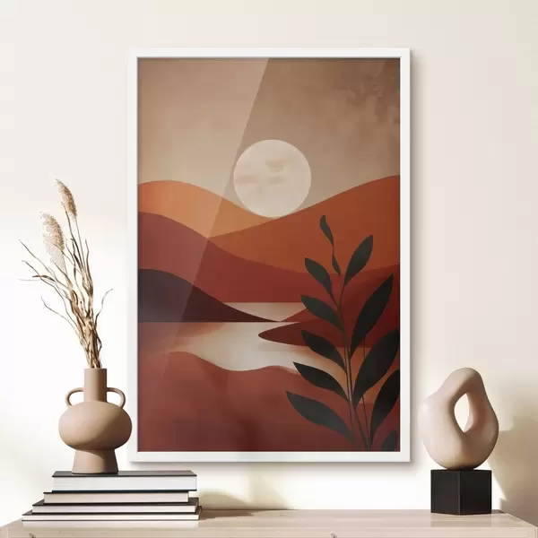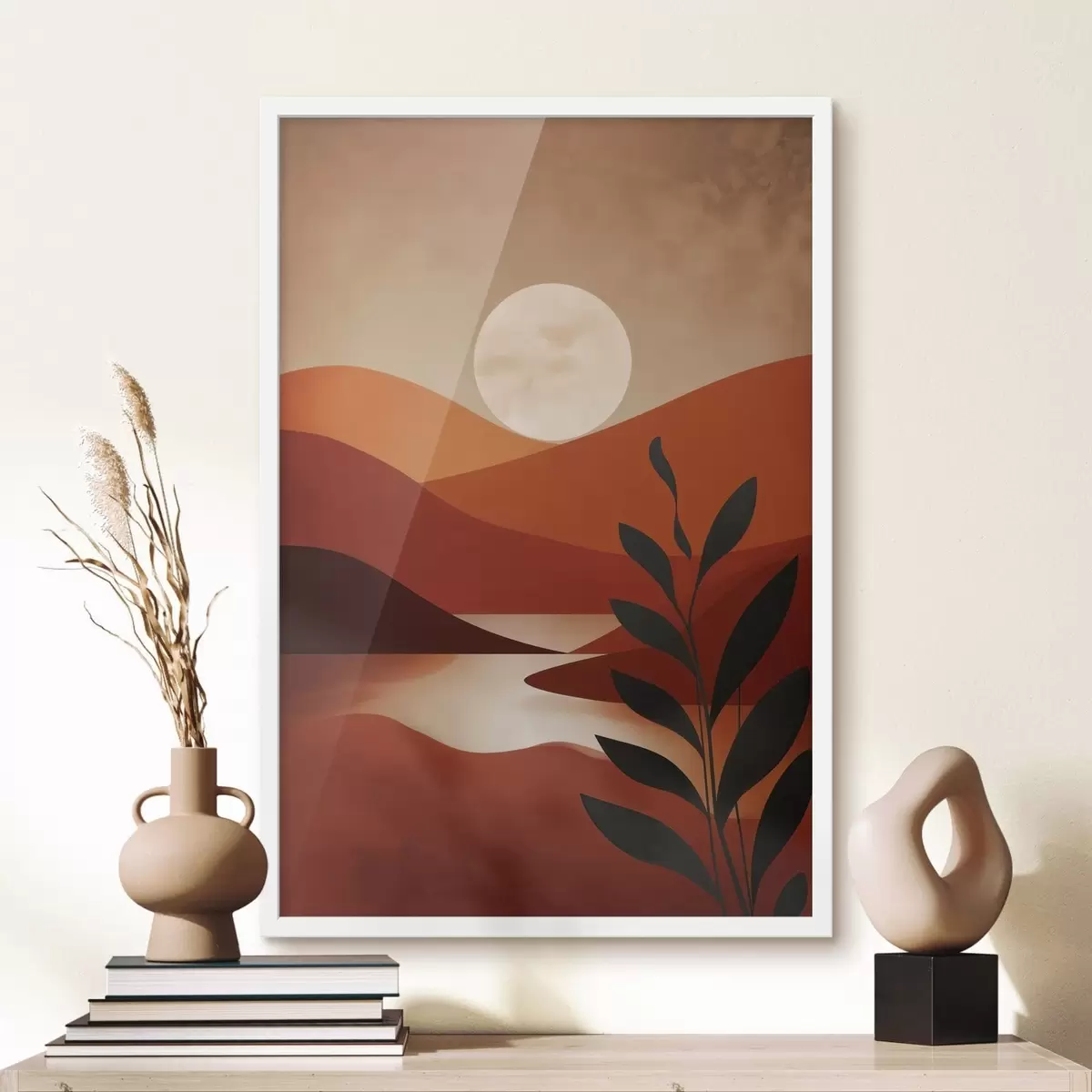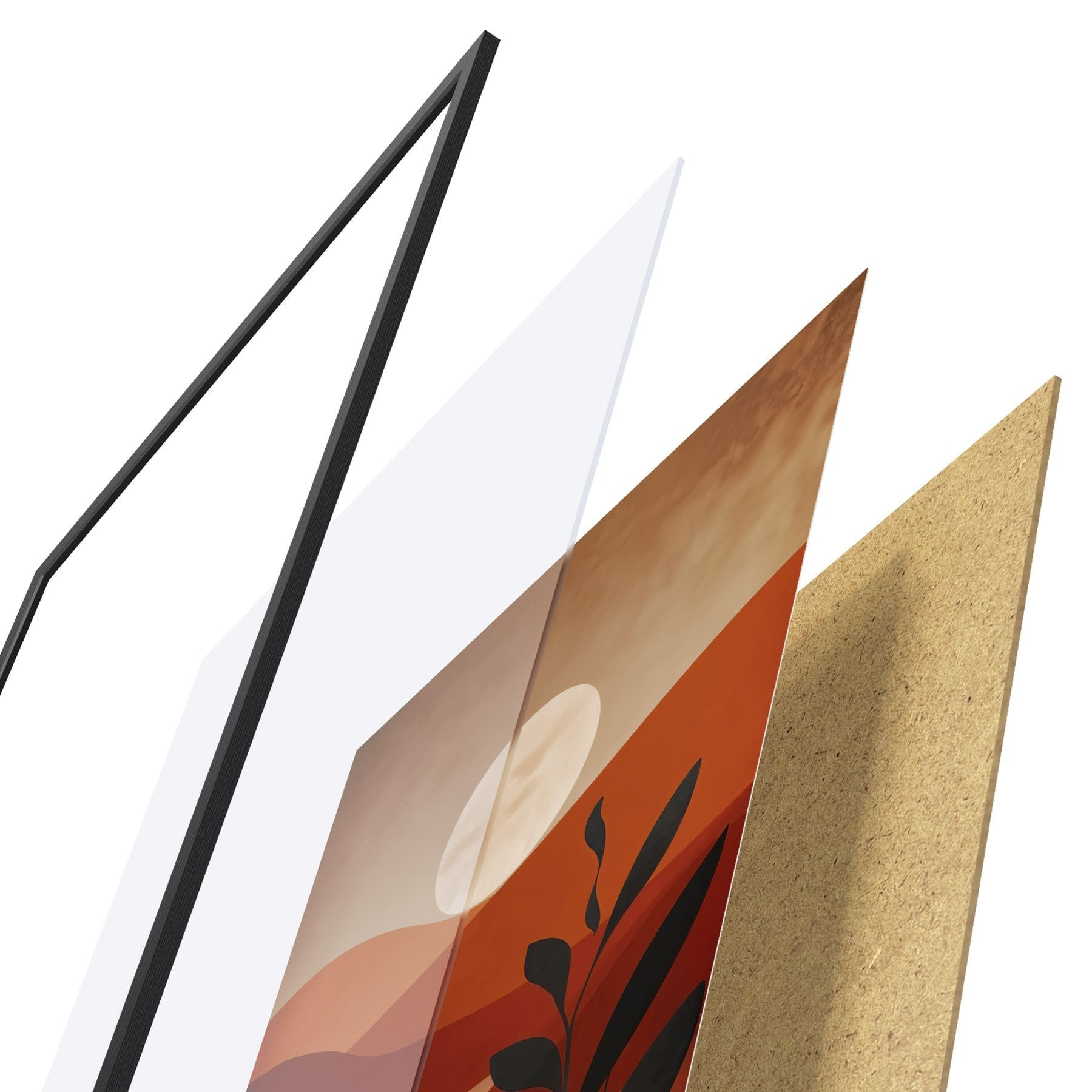 De poster bestaat uit een frame, plexiglas, geprinte afbeelding en spaanplaat achterkant. De poster kan meteen aan de muur worden gehangen dankzij de bevestigingen op de achterkant.