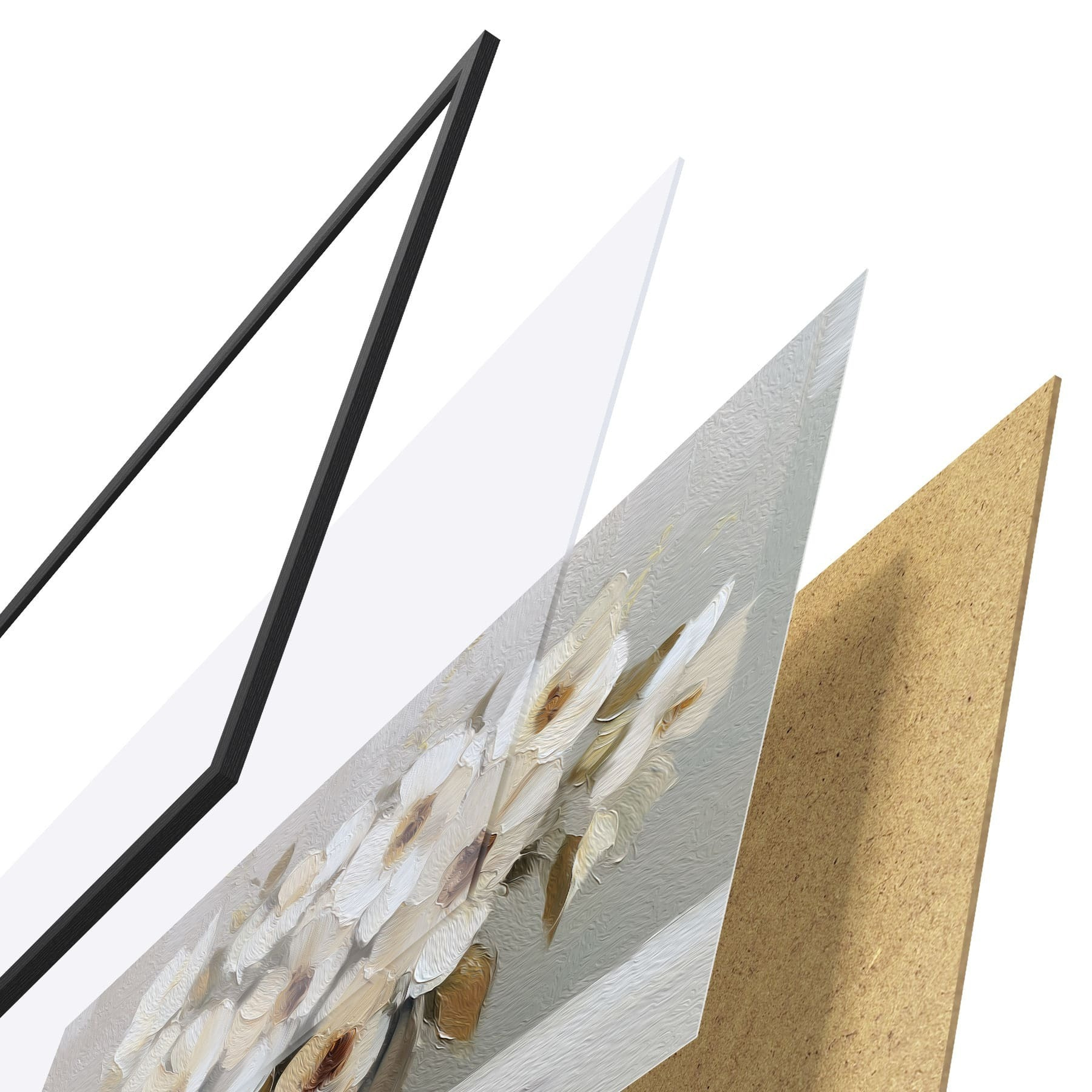De poster bestaat uit een frame, plexiglas, geprinte afbeelding en spaanplaat achterkant. De poster kan meteen aan de muur worden gehangen dankzij de bevestigingen op de achterkant.