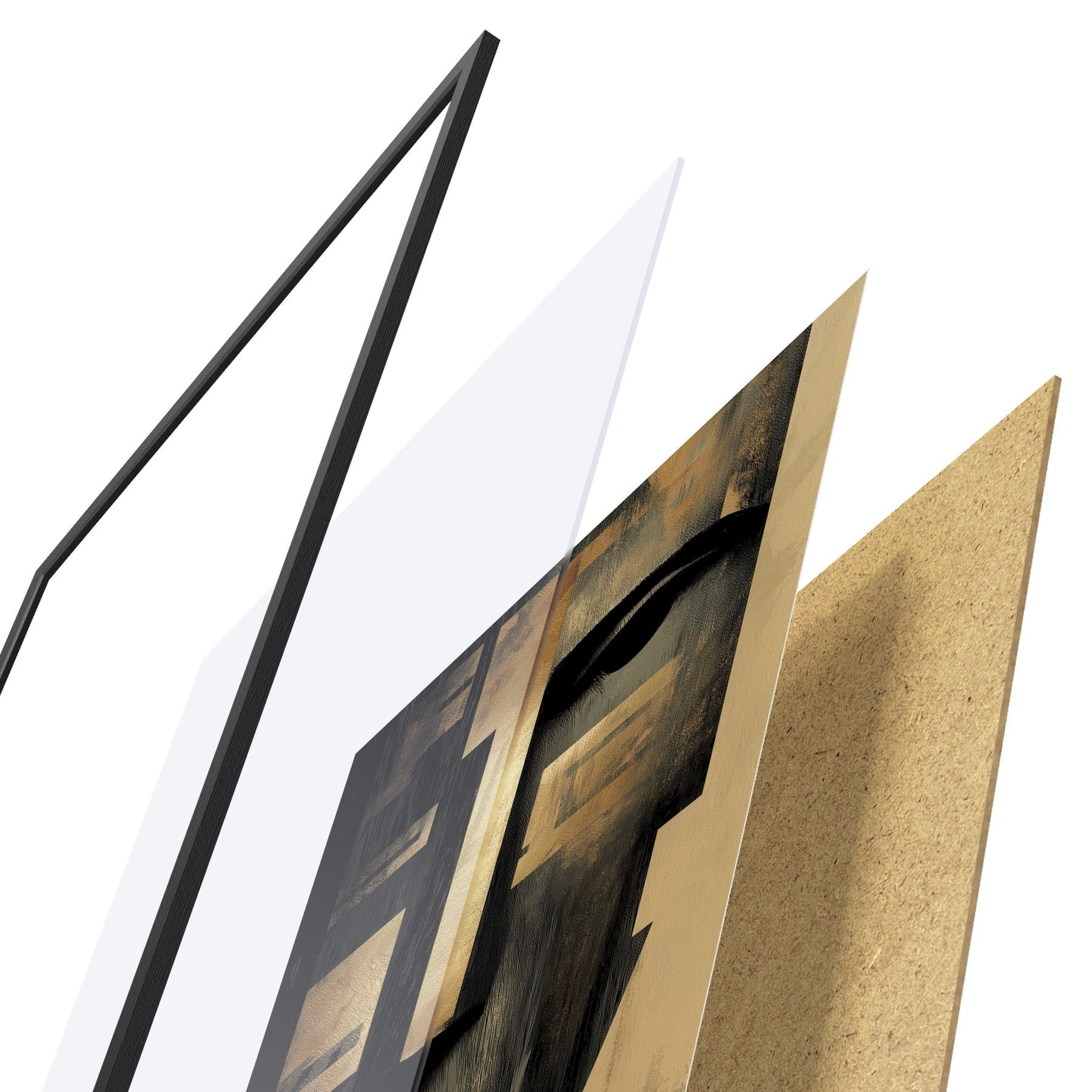 De poster bestaat uit een frame, plexiglas, geprinte afbeelding en spaanplaat achterkant. De poster kan meteen aan de muur worden gehangen dankzij de bevestigingen op de achterkant.