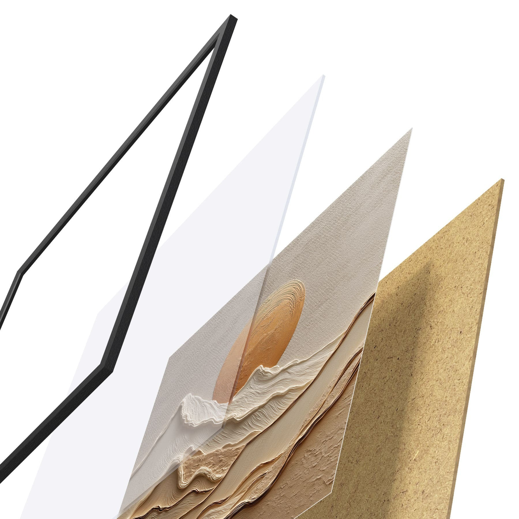 De poster bestaat uit een frame, plexiglas, geprinte afbeelding en spaanplaat achterkant. De poster kan meteen aan de muur worden gehangen dankzij de bevestigingen op de achterkant.