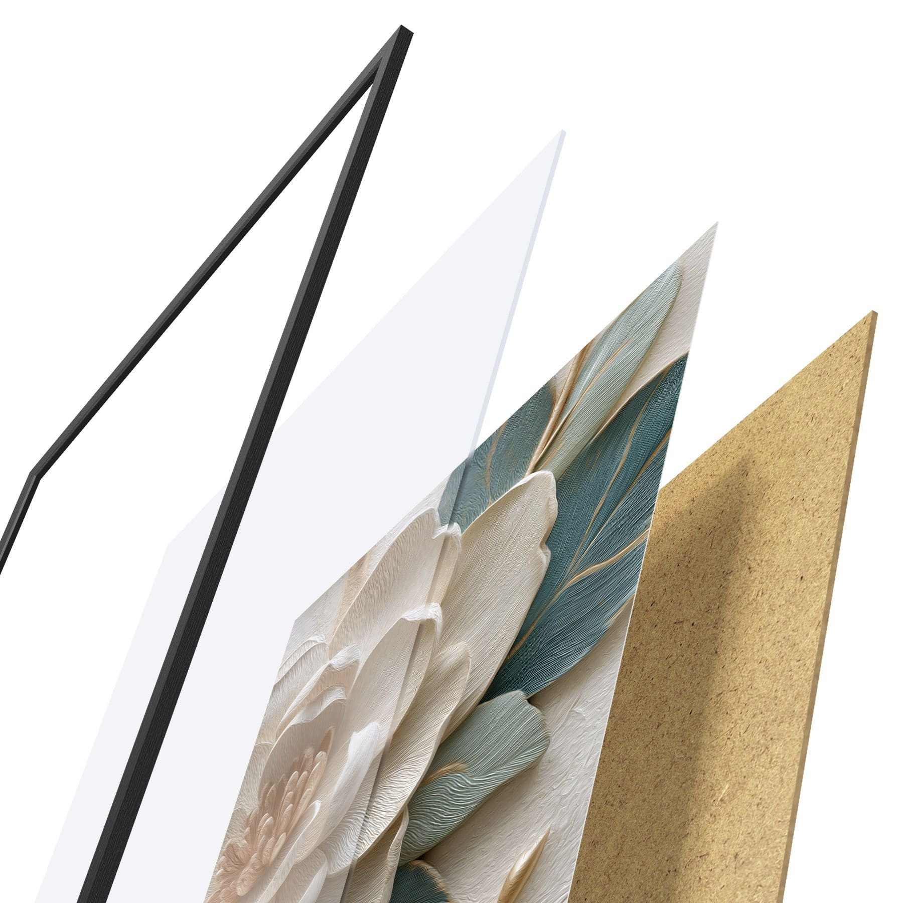 De poster bestaat uit een frame, plexiglas, geprinte afbeelding en spaanplaat achterkant. De poster kan meteen aan de muur worden gehangen dankzij de bevestigingen op de achterkant.