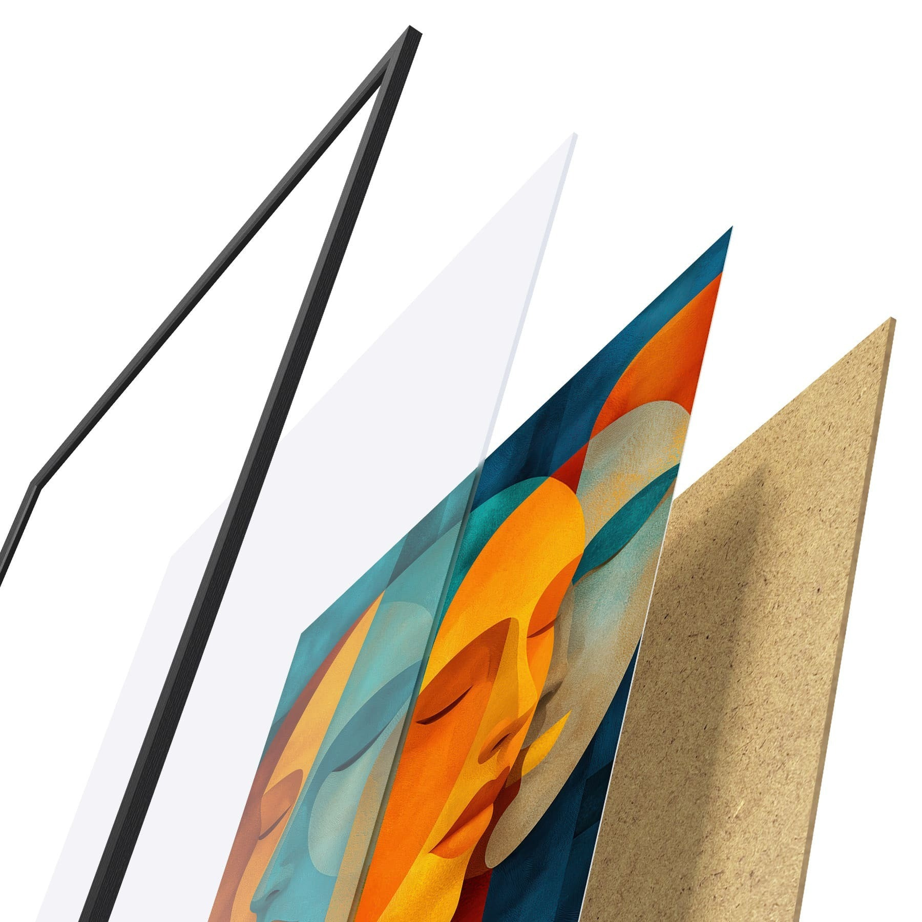 De poster bestaat uit een frame, plexiglas, geprinte afbeelding en spaanplaat achterkant. De poster kan meteen aan de muur worden gehangen dankzij de bevestigingen op de achterkant.