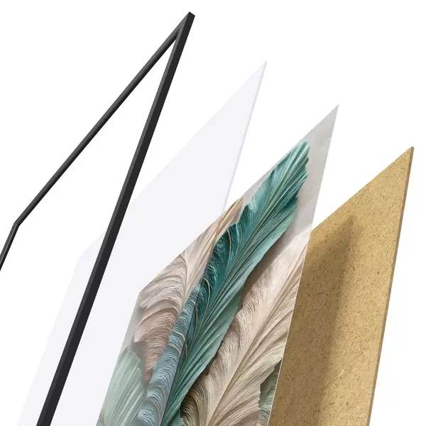 De poster bestaat uit een frame, plexiglas, geprinte afbeelding en spaanplaat achterkant. De poster kan meteen aan de muur worden gehangen dankzij de bevestigingen op de achterkant.