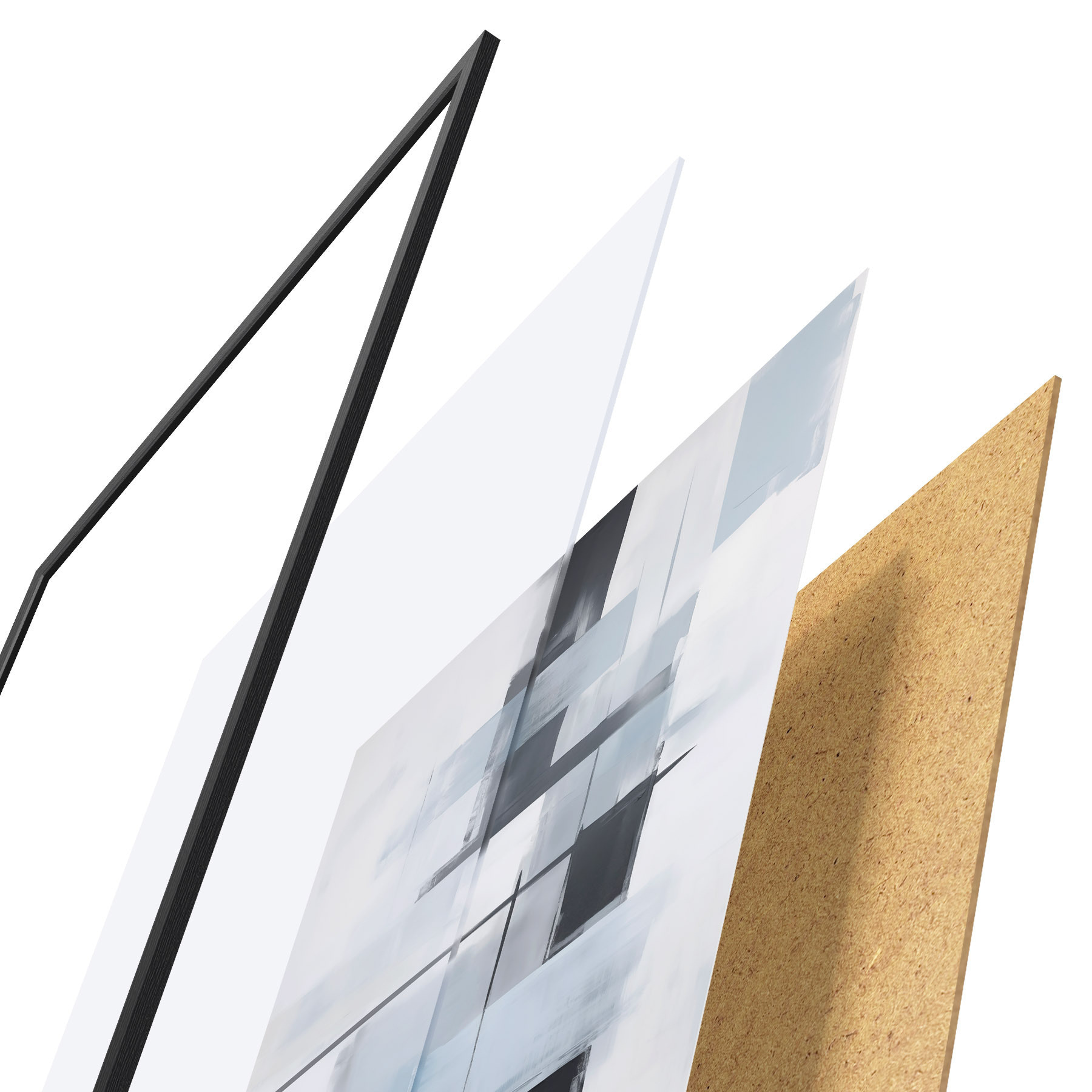 De poster bestaat uit een frame, plexiglas, geprinte afbeelding en spaanplaat achterkant. De poster kan meteen aan de muur worden gehangen dankzij de bevestigingen op de achterkant.