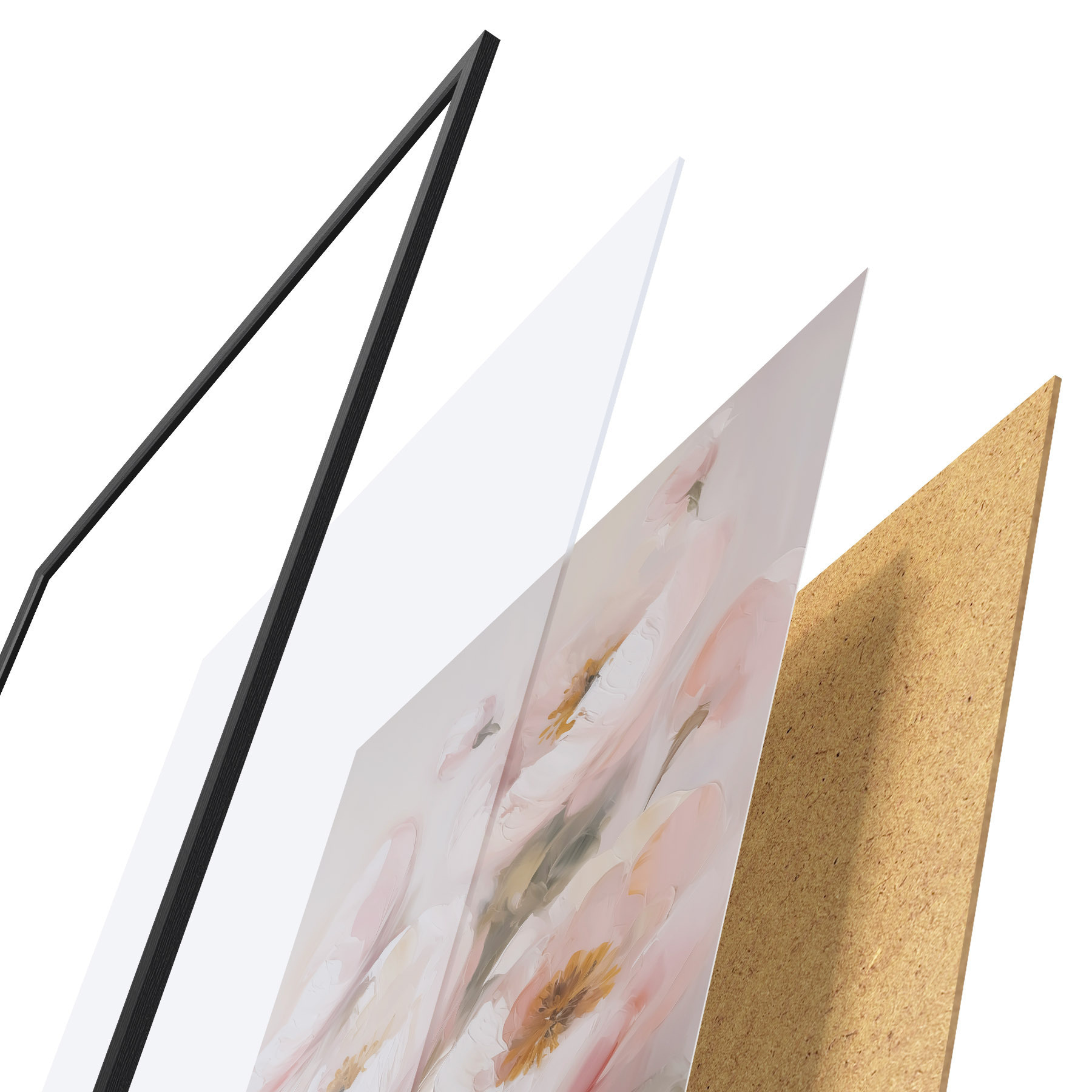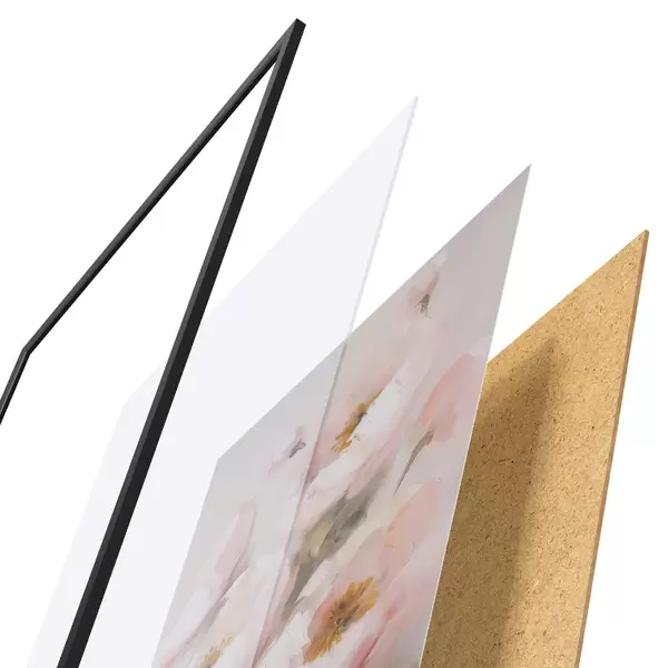 De poster bestaat uit een frame, plexiglas, geprinte afbeelding en spaanplaat achterkant. De poster kan meteen aan de muur worden gehangen dankzij de bevestigingen op de achterkant.