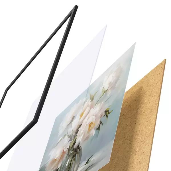 De poster bestaat uit een frame, plexiglas, geprinte afbeelding en spaanplaat achterkant. De poster kan meteen aan de muur worden gehangen dankzij de bevestigingen op de achterkant.