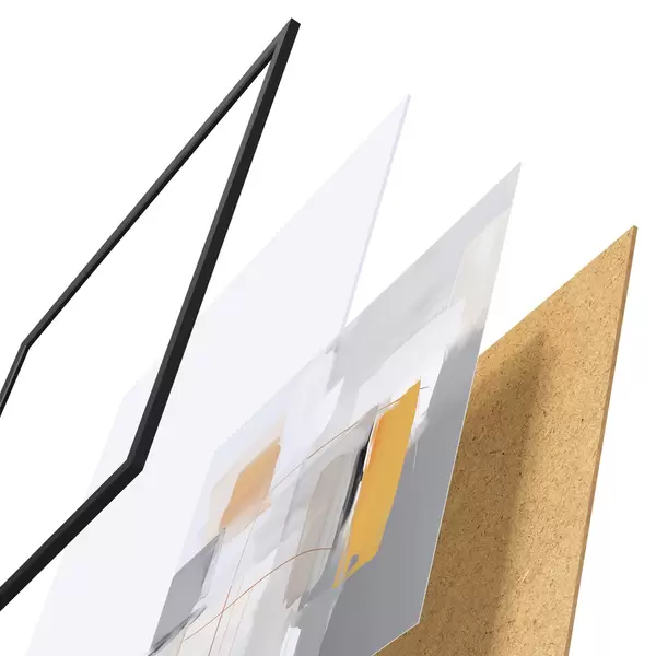 De poster bestaat uit een frame, plexiglas, geprinte afbeelding en spaanplaat achterkant. De poster kan meteen aan de muur worden gehangen dankzij de bevestigingen op de achterkant.