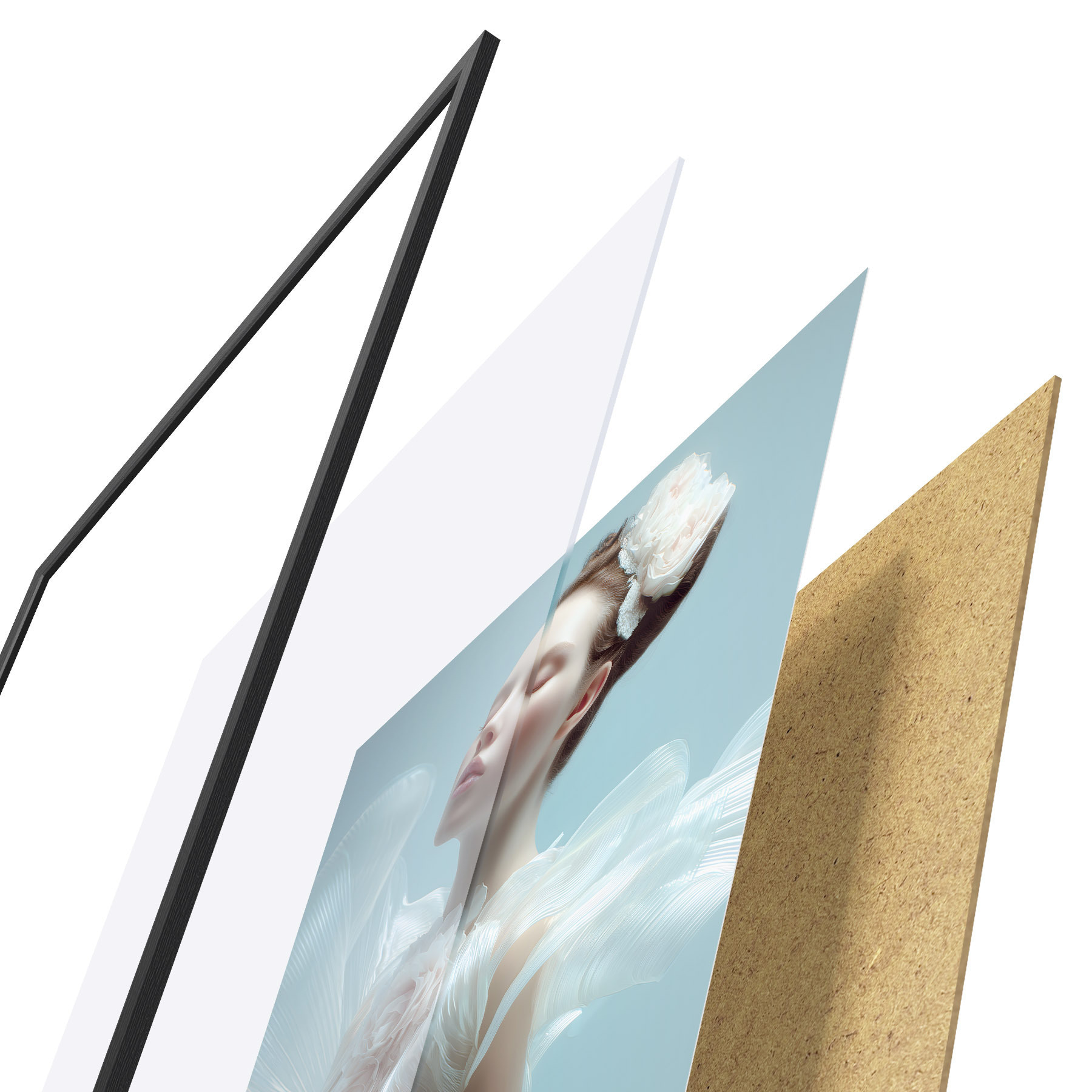 De poster bestaat uit een frame, plexiglas, geprinte afbeelding en spaanplaat achterkant. De poster kan meteen aan de muur worden gehangen dankzij de bevestigingen op de achterkant.
