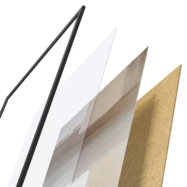 De poster bestaat uit een frame, plexiglas, geprinte afbeelding en spaanplaat achterkant. De poster kan meteen aan de muur worden gehangen dankzij de bevestigingen op de achterkant.