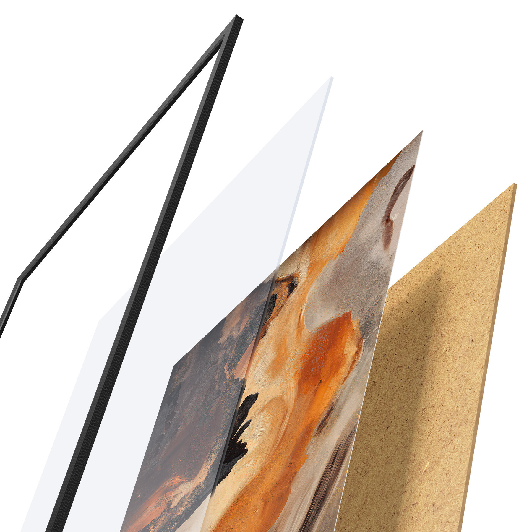 De poster bestaat uit een frame, plexiglas, geprinte afbeelding en spaanplaat achterkant. De poster kan meteen aan de muur worden gehangen dankzij de bevestigingen op de achterkant.