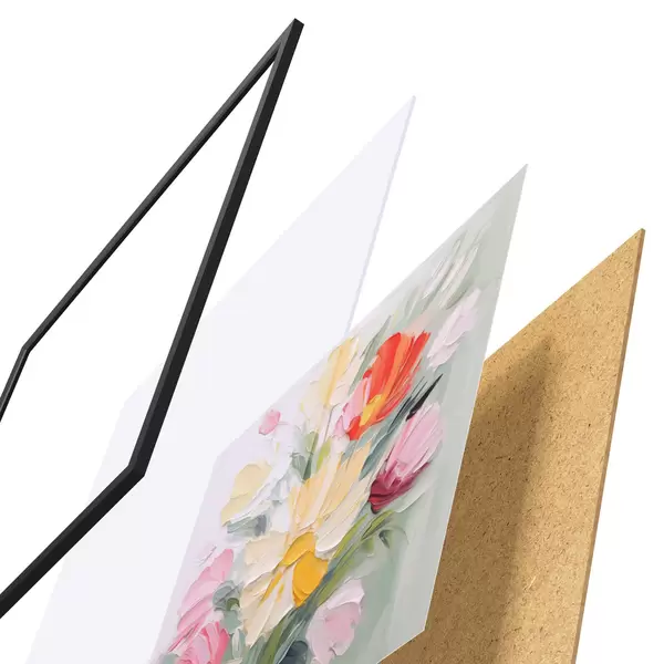 De poster bestaat uit een frame, plexiglas, geprinte afbeelding en spaanplaat achterkant. De poster kan meteen aan de muur worden gehangen dankzij de bevestigingen op de achterkant.
