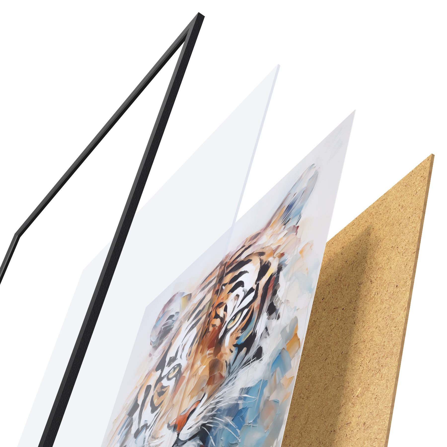 De poster bestaat uit een frame, plexiglas, geprinte afbeelding en spaanplaat achterkant. De poster kan meteen aan de muur worden gehangen dankzij de bevestigingen op de achterkant.