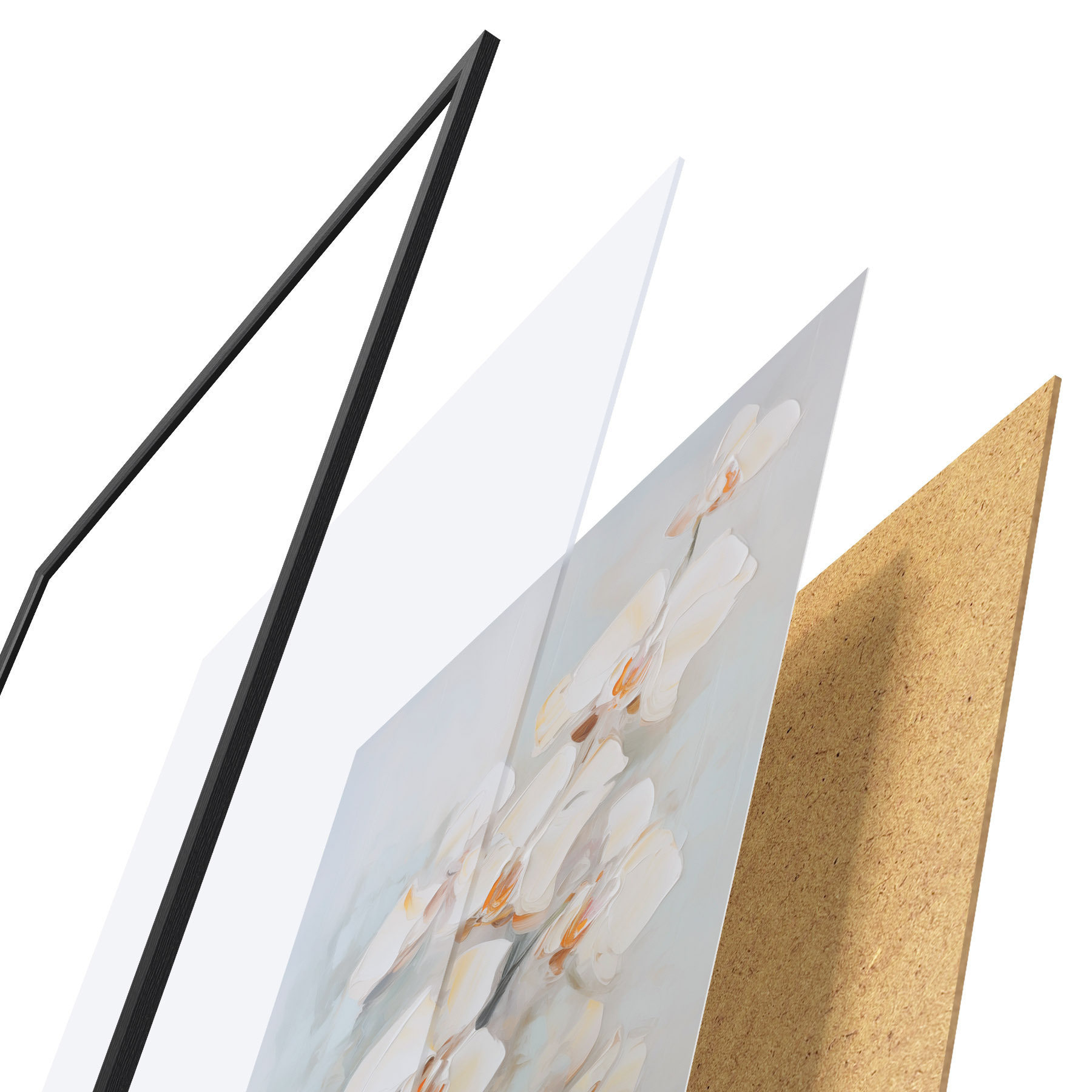 De poster bestaat uit een frame, plexiglas, geprinte afbeelding en spaanplaat achterkant. De poster kan meteen aan de muur worden gehangen dankzij de bevestigingen op de achterkant.