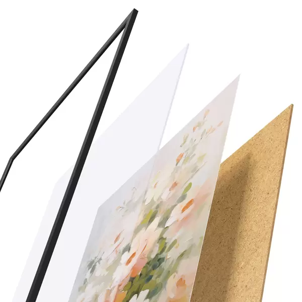 De poster bestaat uit een frame, plexiglas, geprinte afbeelding en spaanplaat achterkant. De poster kan meteen aan de muur worden gehangen dankzij de bevestigingen op de achterkant.