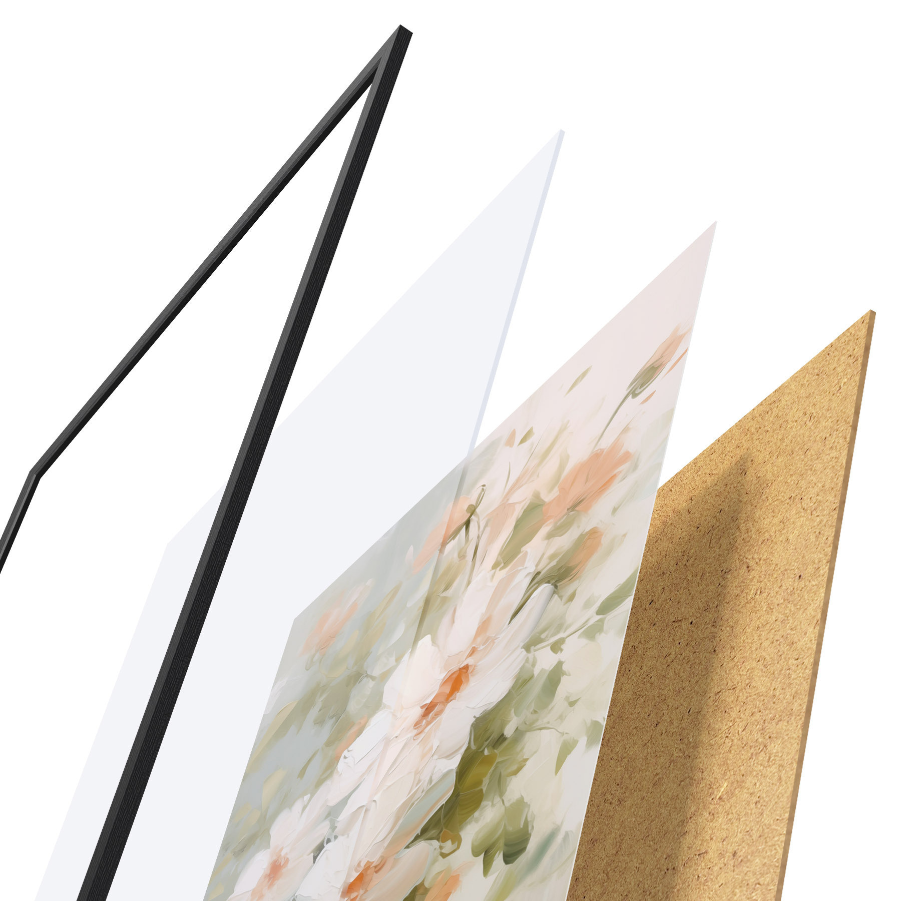 De poster bestaat uit een frame, plexiglas, geprinte afbeelding en spaanplaat achterkant. De poster kan meteen aan de muur worden gehangen dankzij de bevestigingen op de achterkant.
