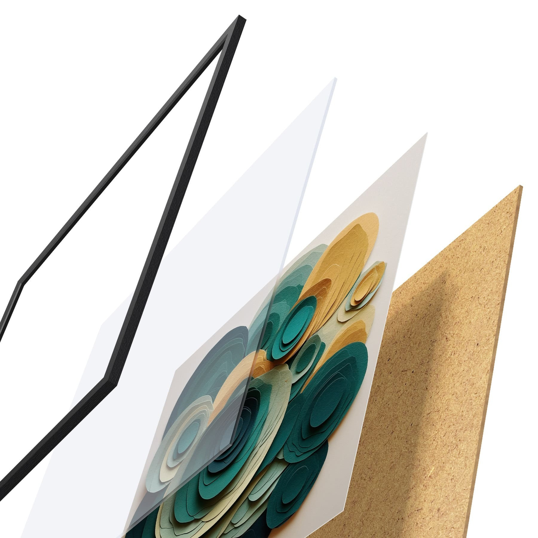 De poster bestaat uit een frame, plexiglas, geprinte afbeelding en spaanplaat achterkant. De poster kan meteen aan de muur worden gehangen dankzij de bevestigingen op de achterkant.