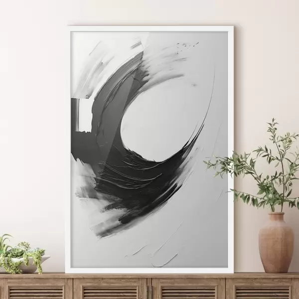 Poster Abstracte zwarte penseelstreek op een lichte achtergrond f48340