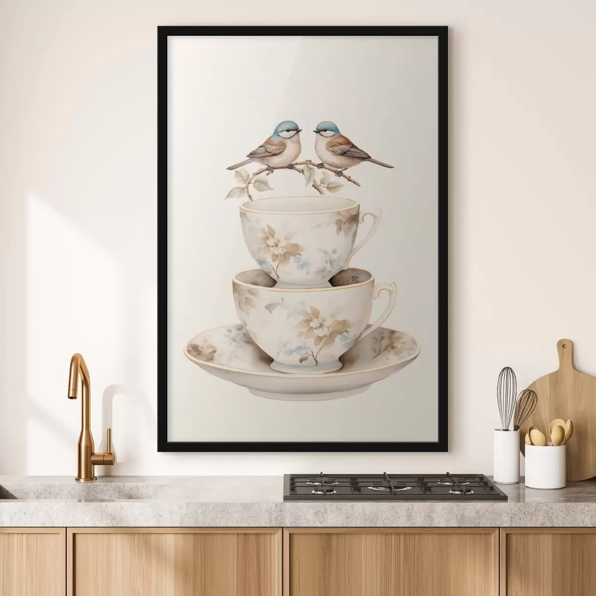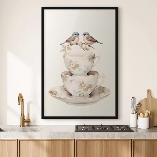 Poster Twee vogels op een tak boven theekopjes N° f48347