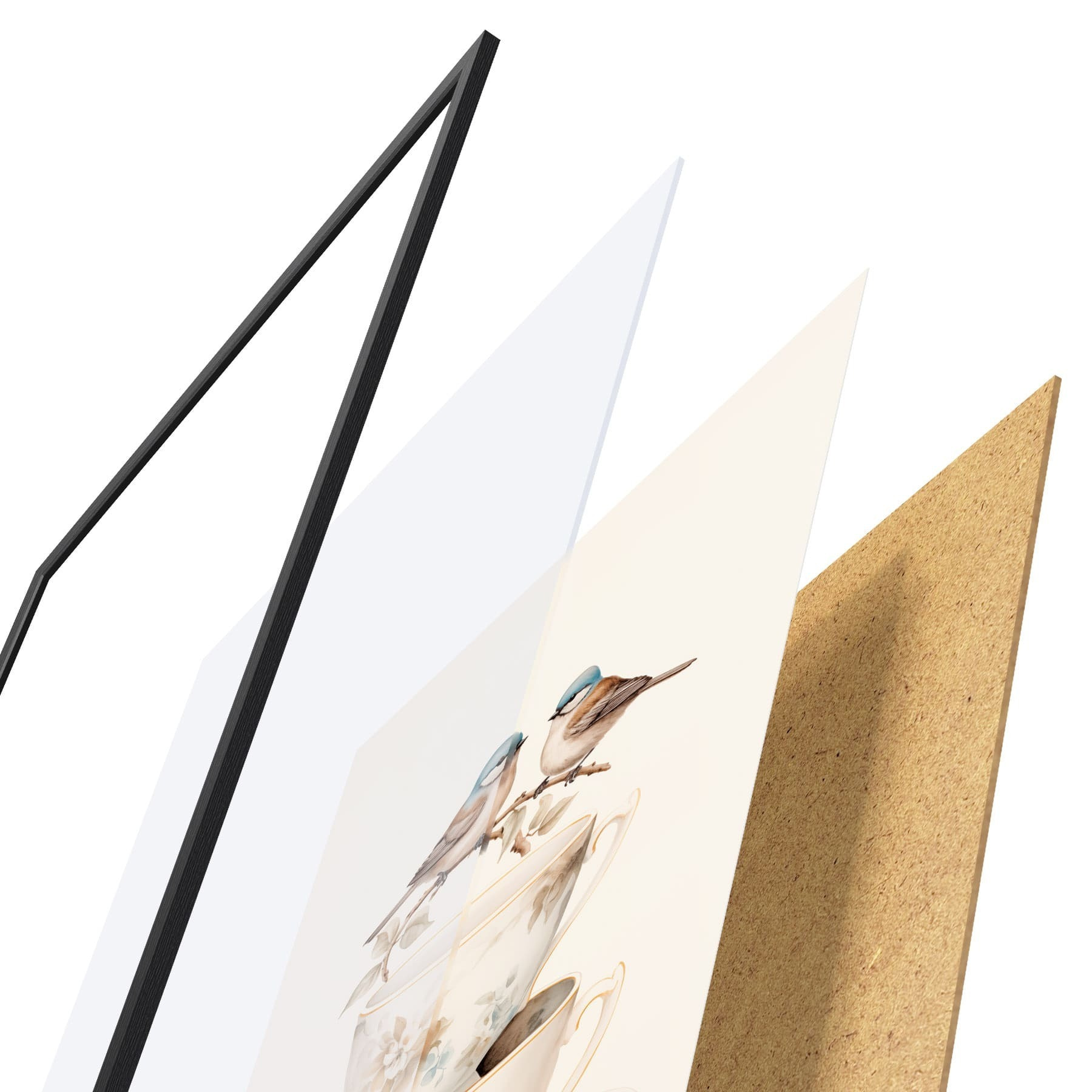 De poster bestaat uit een frame, plexiglas, geprinte afbeelding en spaanplaat achterkant. De poster kan meteen aan de muur worden gehangen dankzij de bevestigingen op de achterkant.