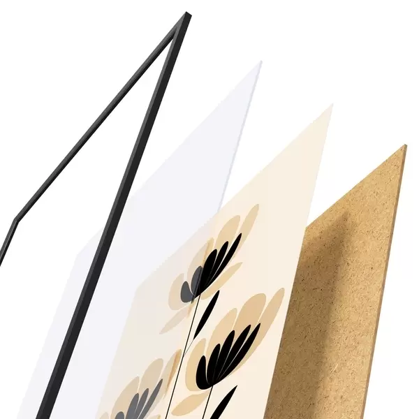 De poster bestaat uit een frame, plexiglas, geprinte afbeelding en spaanplaat achterkant. De poster kan meteen aan de muur worden gehangen dankzij de bevestigingen op de achterkant.