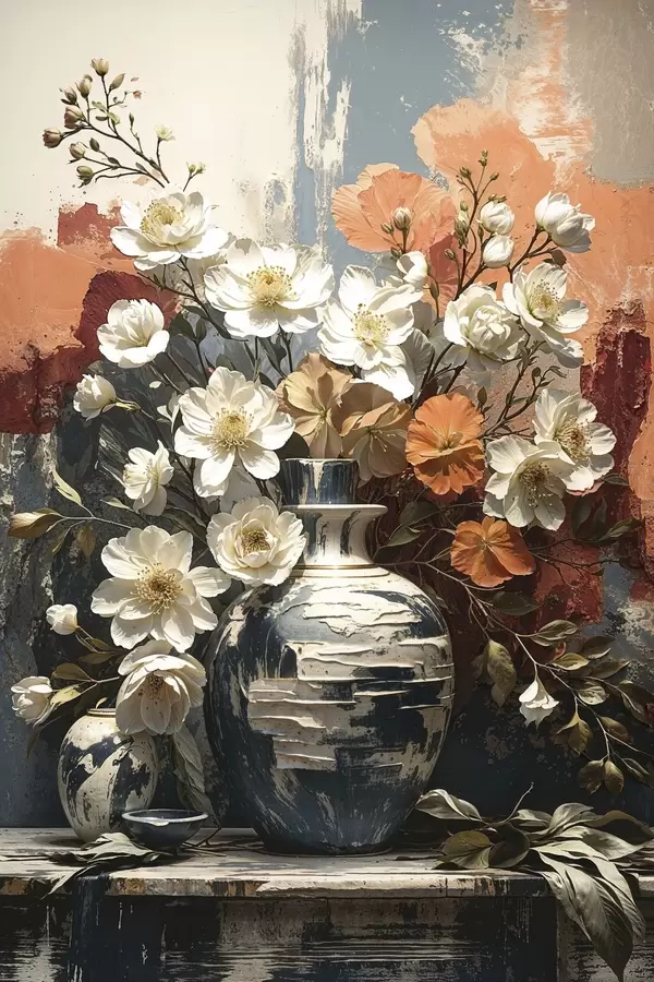 Poster Bloemen in vazen tegen een muur met structuur N° f48360