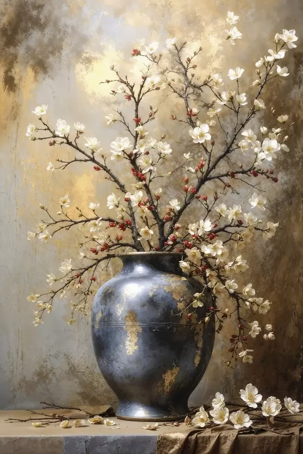 Poster Bloeiende takken in een vaas tegen een neutrale achtergrond N° f48361