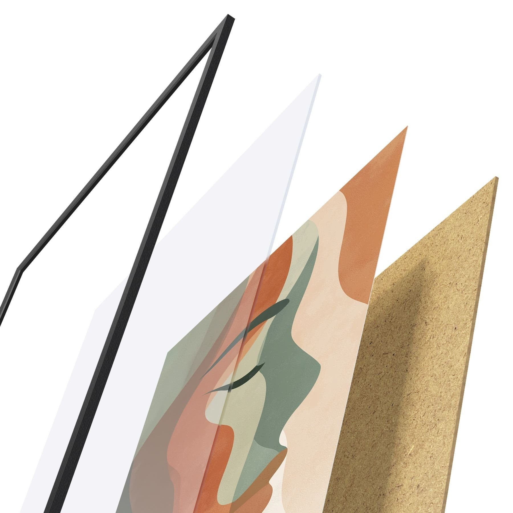 De poster bestaat uit een frame, plexiglas, geprinte afbeelding en spaanplaat achterkant. De poster kan meteen aan de muur worden gehangen dankzij de bevestigingen op de achterkant.