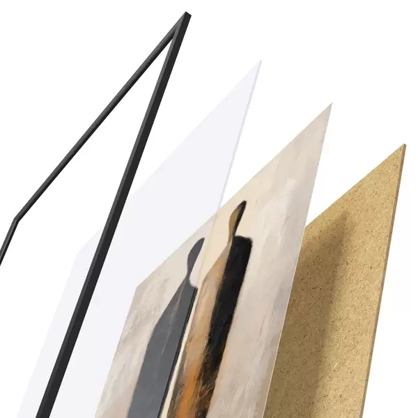 De poster bestaat uit een frame, plexiglas, geprinte afbeelding en spaanplaat achterkant. De poster kan meteen aan de muur worden gehangen dankzij de bevestigingen op de achterkant.