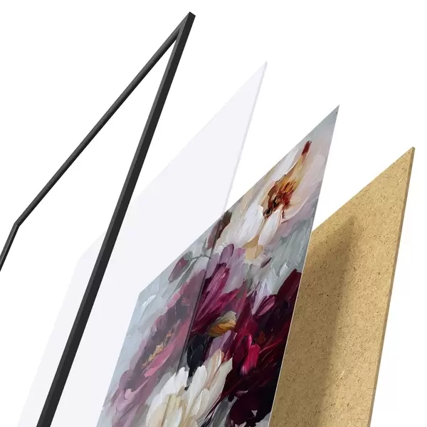 De poster bestaat uit een frame, plexiglas, geprinte afbeelding en spaanplaat achterkant. De poster kan meteen aan de muur worden gehangen dankzij de bevestigingen op de achterkant.
