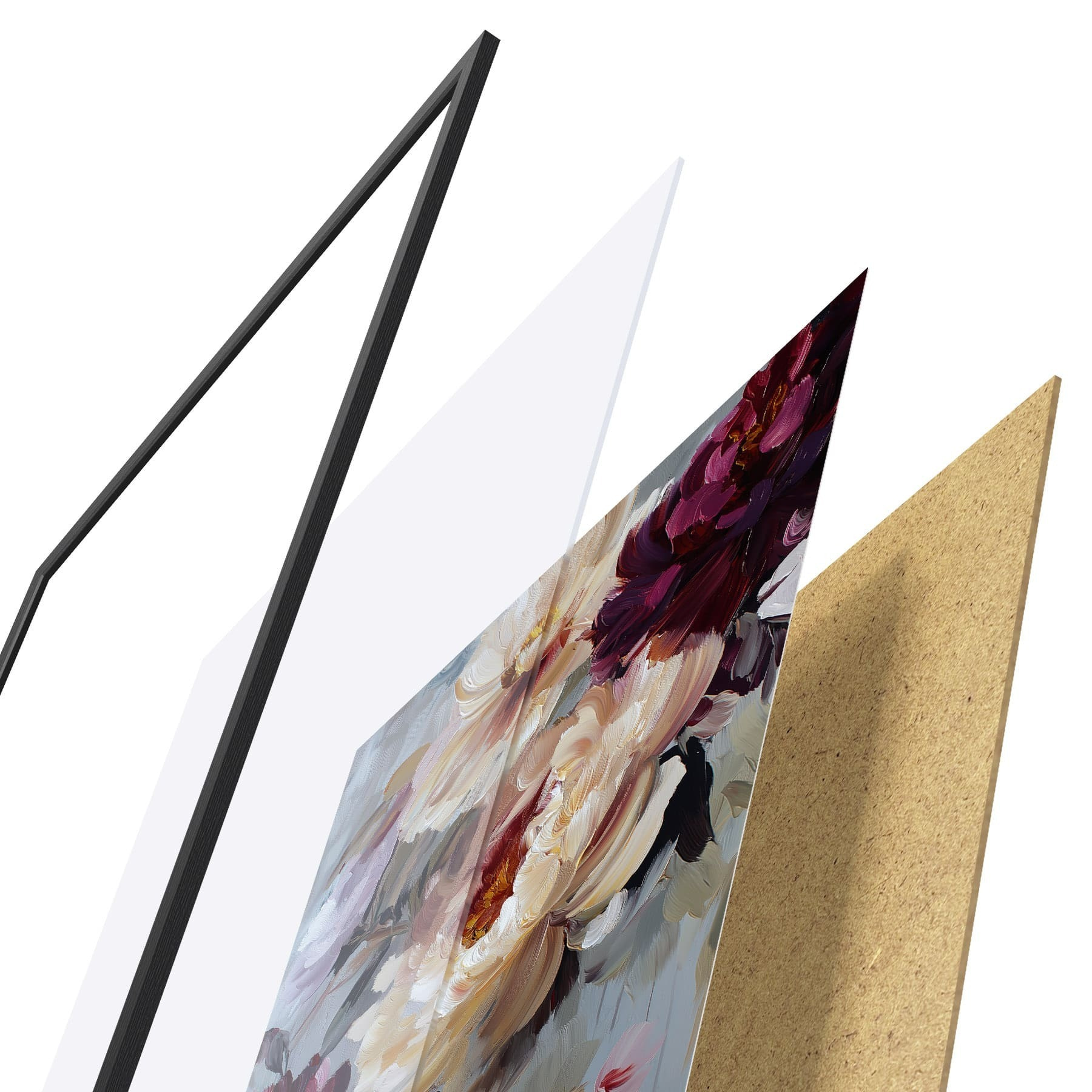 De poster bestaat uit een frame, plexiglas, geprinte afbeelding en spaanplaat achterkant. De poster kan meteen aan de muur worden gehangen dankzij de bevestigingen op de achterkant.