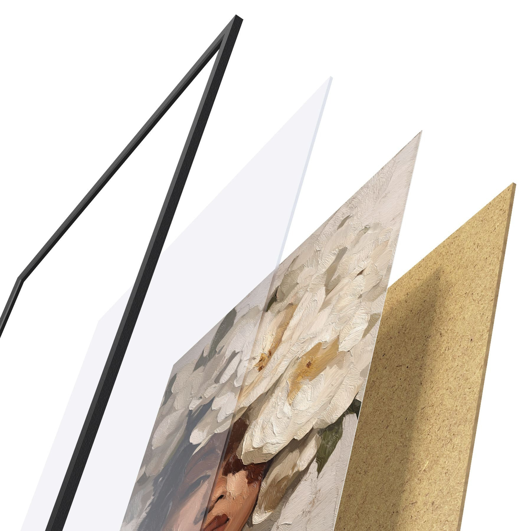 De poster bestaat uit een frame, plexiglas, geprinte afbeelding en spaanplaat achterkant. De poster kan meteen aan de muur worden gehangen dankzij de bevestigingen op de achterkant.